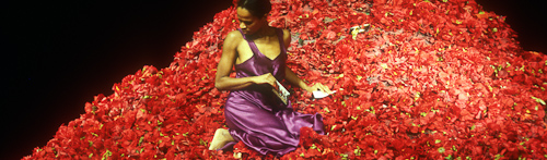 Rosenblättern, auf den die Tänzer hinaufklettern, in Blumen baden, sich mit Blüten