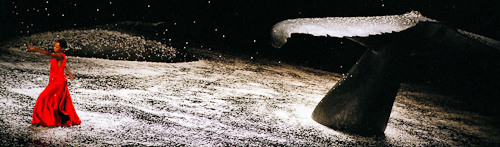 Das Bühnenbild zeigt einen Wal schwimmend im Meer, seine riesige Heckflosse ragt gerade